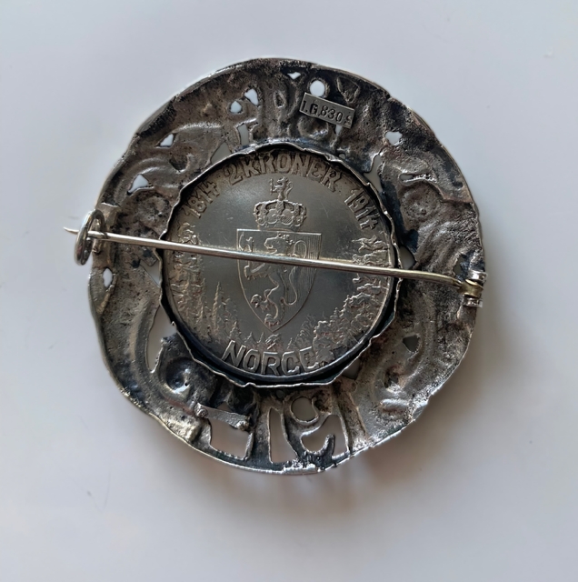Skade/ mangel høyre side Mor Norge Norsk antikk brosje i sølv med innfelt 2-krone mynt norrøn viking mønster I.G. 830S Brosjen har omfattende aldersrelatert patina og det synes å være en skade/ mangel på høyre side ( se bilde nr 2), til tross for dette fremstår den som et flott og spennende samleobjekt. Diameter ca 5 cm. NOK495,00 inkl. mva. På lager: 1 stk. Kjøp Ønskeliste Vipps hurtigkasseKjøp nå med Vipps hurtigkasse Del dette Produktinfo Varen kan sendes eller hentes etter avtale på butikklageret i Tysvær NB! man får spørsmål om hente/sending først etter at man har registrert adressen. Fast fraktpris 73 kr for kjøp <1000 kr og gratis frakt ved kjøp ≥1000 kr (Begge alternativene gjelder for forsendelser med vekt 0-10 kg). Har du bestilt, men hører ikke noe i fra meg? Sjekk mappen for uønsket e-post.