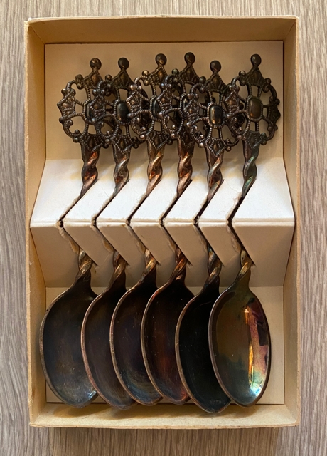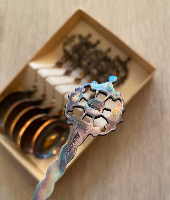NORWAY teskje dessertskje sølvplett 40 gr med original eske 1950/60-tallet 6 stk skjeer selges samlet. De er merker NORWAY og 40gr, lengde ca 11,3 cm. Skjeene trenger en real puss ellers fremstår de i flott vintage stand. NOK475,00 inkl. mva. På lager: 1 stk. Kjøp Ønskeliste Vipps hurtigkasseKjøp nå med Vipps hurtigkasse Del dette Produktinfo Varen kan sendes eller hentes etter avtale på butikklageret i Tysvær NB! man får spørsmål om hente/sending først etter at man har registrert adressen. Fast fraktpris 73 kr for kjøp <1000 kr og gratis frakt ved kjøp ≥1000 kr (Begge alternativene gjelder for forsendelser med vekt 0-10 kg). Har du bestilt, men hører ikke noe i fra meg? Sjekk mappen for uønsket e-post.
