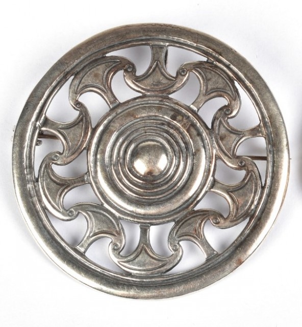 Rund brosje i oksidert sølv (925S). ESPELAND, SIGMUND. Gjennombrutt dekor i vikingstil, bl. a. fra Snorre-serien. Ø5,5 cm Fin stand.