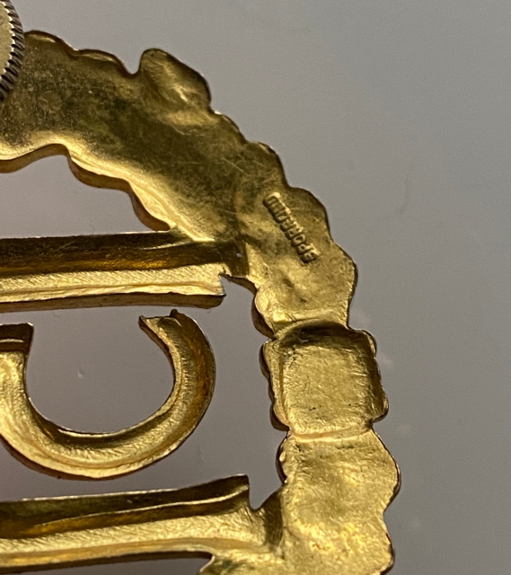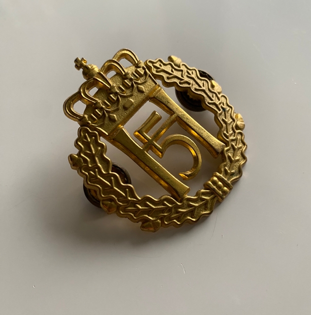 Luemerke i patinert metall. Stemplet med Aksel Holmsen Oslo. Ingen skader eller skjemmende bruksmerker, men det kan observeres noe slitasje og patina. Ikke forsøkt rengjort. Mål ca 3,9x4,7 cm.