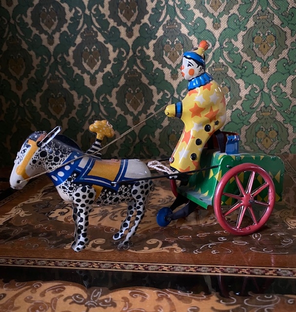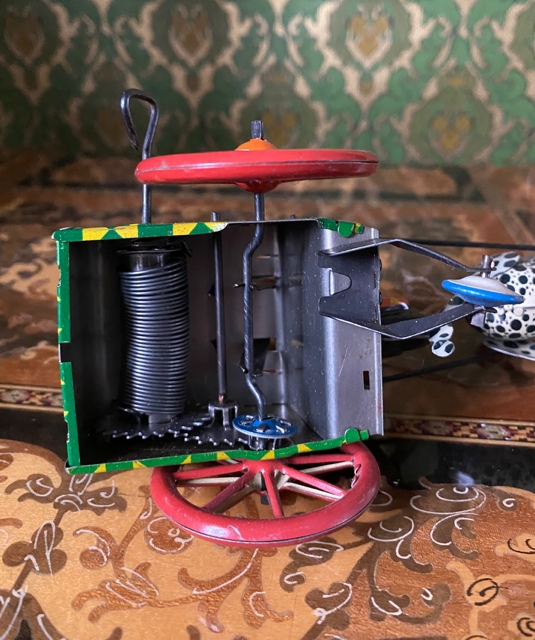 Motorsykkel i blikk. Trekkopp/ mekanisk leke med nøkkel og fungerende. H12,5x L18,5x B4 cm. Sykkelen har patina og aldersrelaterte bruksmerker, men er uten tvil veldig artig, dekorativ og et ettertraktet samleobjekt.