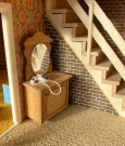 Kommode i heltre. En hvit telefon er festet fast med lim og det er limrester på baksiden av kommoden ellers er dette et dukkehusmøbel i flott vintage stand.