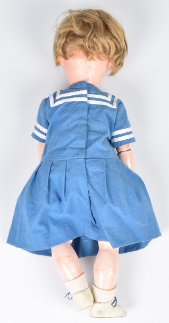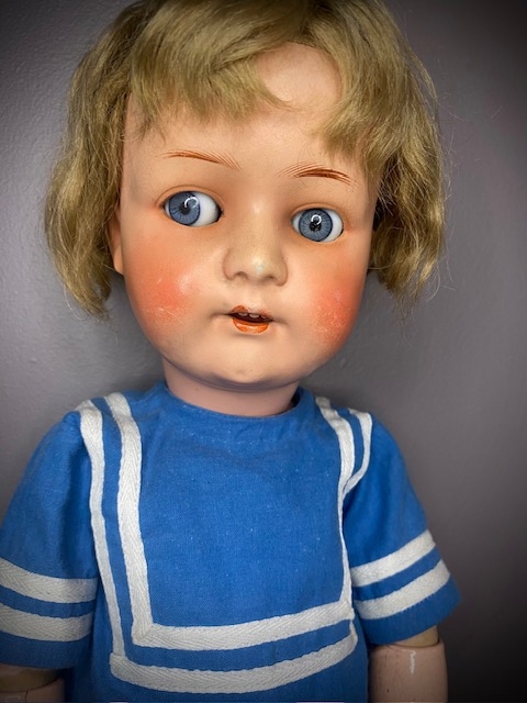 Dukke med håndmalt porselens hodet, mohair hår, flørteøyne (ser fra side til side) og ledd kompositt kropp. Tidstypiske klær av nyere dato. Dukken mangler øyenvipper og det er stedvis slitasje på kompositt kroppen. Fremstår allikevel i flott stand.