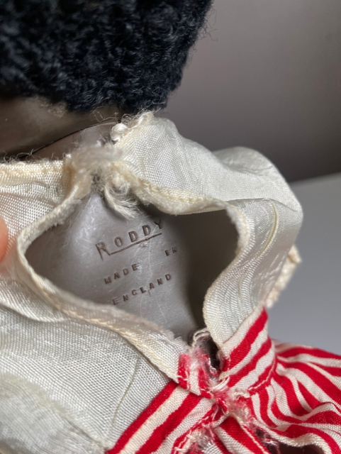 Antatt Tysk dukke med hode i porselen, kropp i komposittmaterialet, glassøyne og hår i ukjent materialet. Håret er løst, krakelering maling torso og avskalling hårfestet bak. Sko og klær uten skjemmende flekker, men med aldersrelatert slitasje. H37 cm.