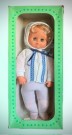 Ubrukt dukke med tidstypiske klær i ubrutt original eske. Dukken er ca 49 cm høy og har en myk kropp, mens hode, armer og føtter er i vinyl/ myk gummi. Esken har noe slitasje og følgende mål L58,5x B26x H13 cm.