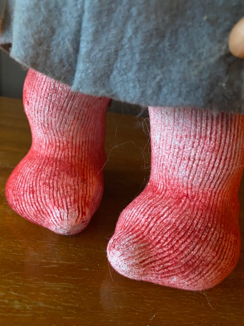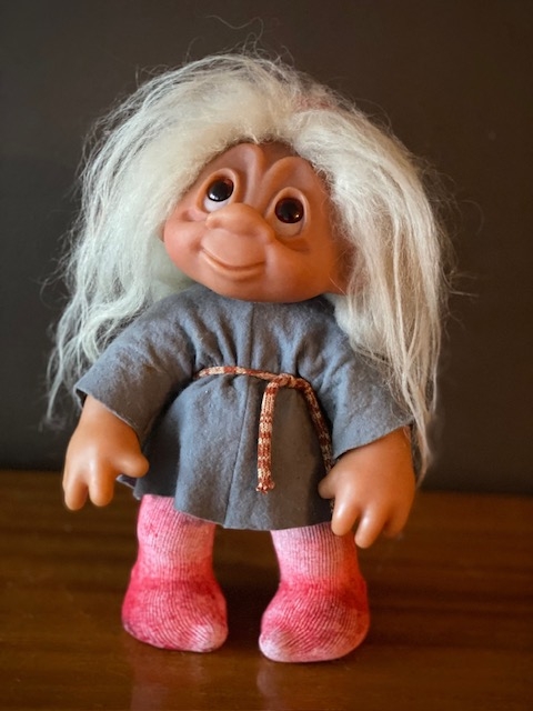 Klærne er noe preget av alder. Ingen skader, men buksa og jumper har løsnet bak og man finner aldersrelatert patina. Trollet er midlertid veldig flott med hår av ekte ull. Høyde ca 35.