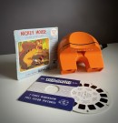 View-master i bakelite og med original eske. 4 stykk "film hjul" følger med. Esken har klare farger, men det er rift i to av hjørnene på lokket. Mål eske ca H8x L13x B10,5 cm. Ingen skader, feil eller mangler er avdekket.